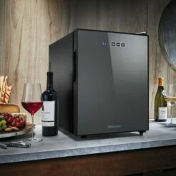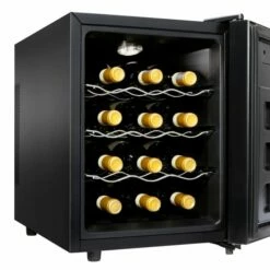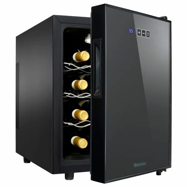 This stunning wine fridge holds twelve standard wine bottles like Bordeaux. Its easy-to-use digital touchscreen controls provide easy access to set the internal temperature for your wine collection. State-of-the-art solid-state cooling technology meets the latest energy efficiency guidelines dictated by the U.S. Department of Energy. Ideal for small collections.