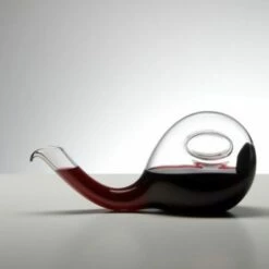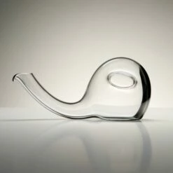 The Riedel Escargot Decanter has a double aeration effect. The first aeration occurs when the wine is poured from the bottle into the decanter, exposing the bottle’s content to oxygen. (Lift the decanter from a horizontal to a vertical position to fill the decanter.) The second contact with oxygen is triggered when the wine is poured out of the decanter and into the glass. (Hold the decanter by the oval indent for conveyance when pouring.) The decanter construction forces fresh air through the already decanted wine a second time to fill the air space in the decanter. Because they are mouthblown by only the most experienced master glass blowers, no two decanters are exactly alike.