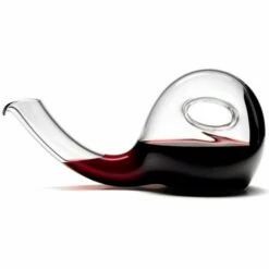 The Riedel Escargot Decanter has a double aeration effect. The first aeration occurs when the wine is poured from the bottle into the decanter, exposing the bottle’s content to oxygen. (Lift the decanter from a horizontal to a vertical position to fill the decanter.) The second contact with oxygen is triggered when the wine is poured out of the decanter and into the glass. (Hold the decanter by the oval indent for conveyance when pouring.) The decanter construction forces fresh air through the already decanted wine a second time to fill the air space in the decanter. Because they are mouthblown by only the most experienced master glass blowers, no two decanters are exactly alike.