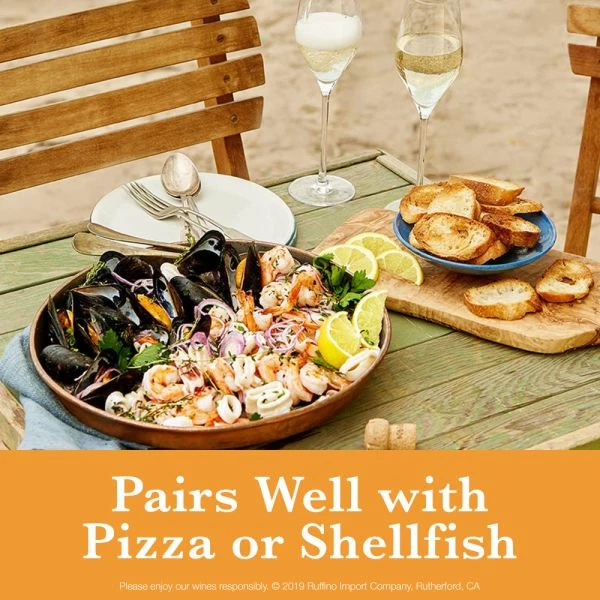 Ideal as an aperitif; it is very versatile as a food companion. Ruffino Prosecco perfectly matches with pizza, fish and shellfish dishes as well as white meat dishes.