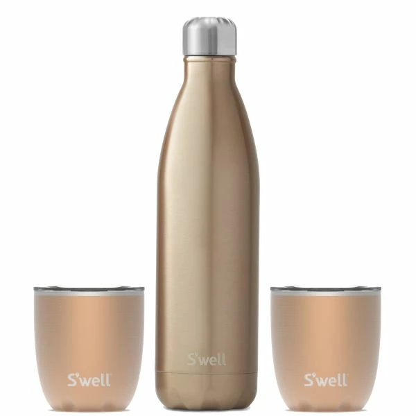 A metallic take on a classic hue, Pyrite is a winning mix of lustrous brass and antique gold. With a 25.4 oz insulated bottle (which fits a whole bottle of wine) and two 10 oz insulated Tumblers, this giftable set is perfect for adventurers, picnic-lovers, cocktail pros, and entertainers. Set is High-Grade 18/8 Stainless Steel, eco-friendly, BPA-free and reusable with triple-walled stainless steel for maximum insulation that leaves no condensation on the exterior. Aside from a great stylish look, the insulated bottle helps to keep wine at the right temperature for up to 24 hours while the tumblers’ thin rim makes for an fun and enjoyable drinking experience. Tumblers are easily stackable for storing and packing.